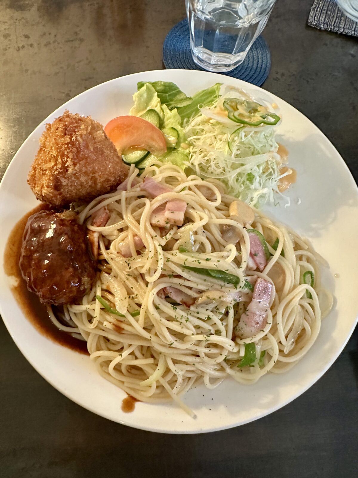 お得なセットメニューから、スパゲティ、ハンバーグ。ライスコロッケ、サラダの付いたDセット 1100円 大盛りなのでプラス220円
