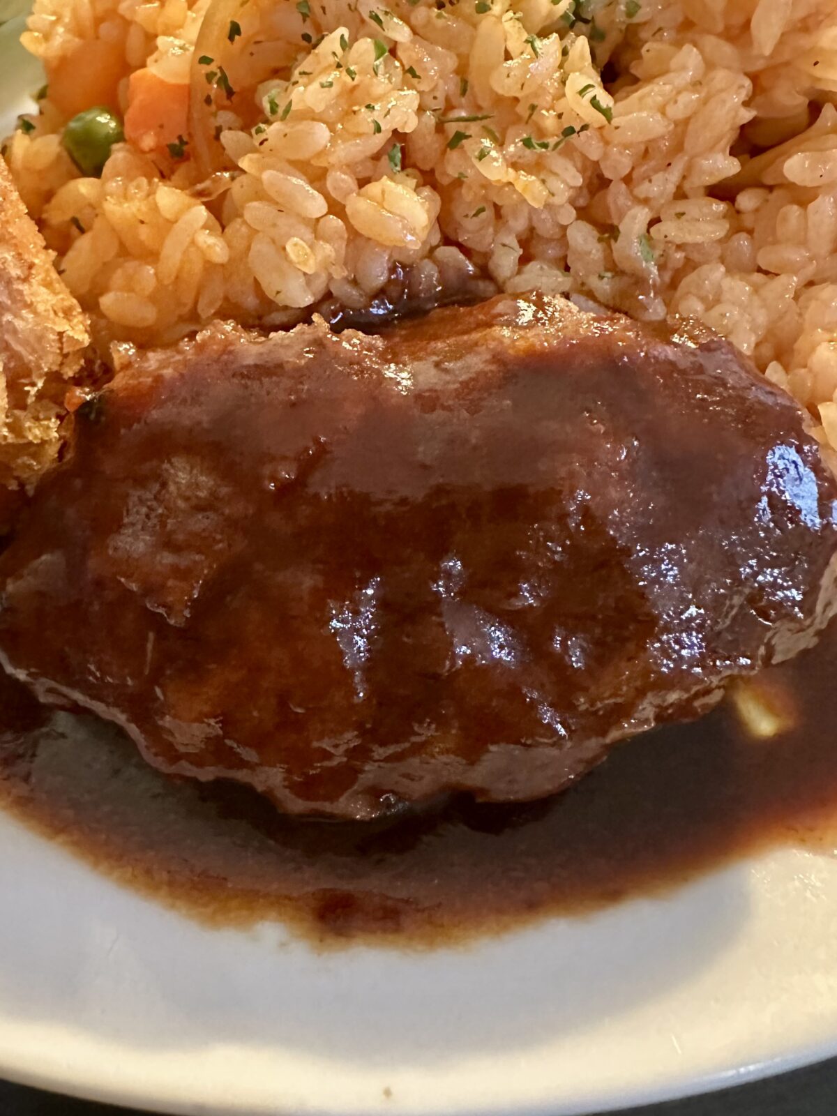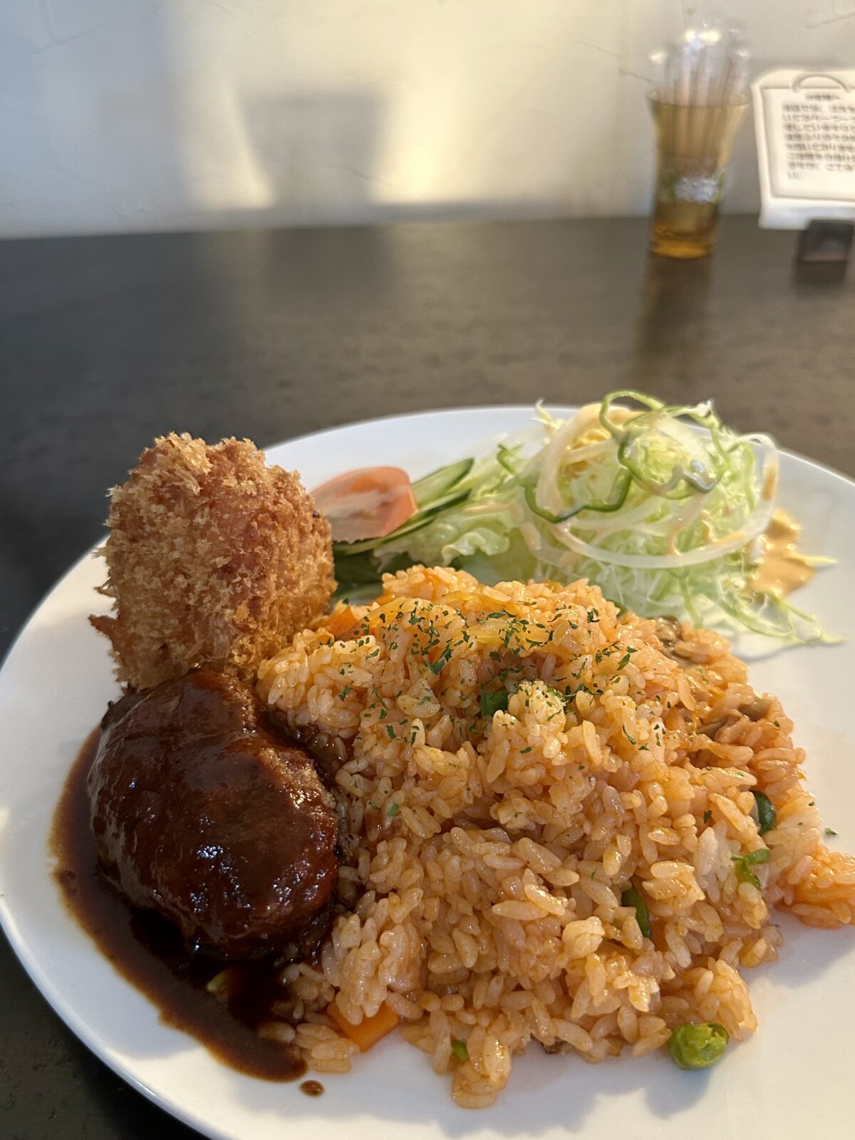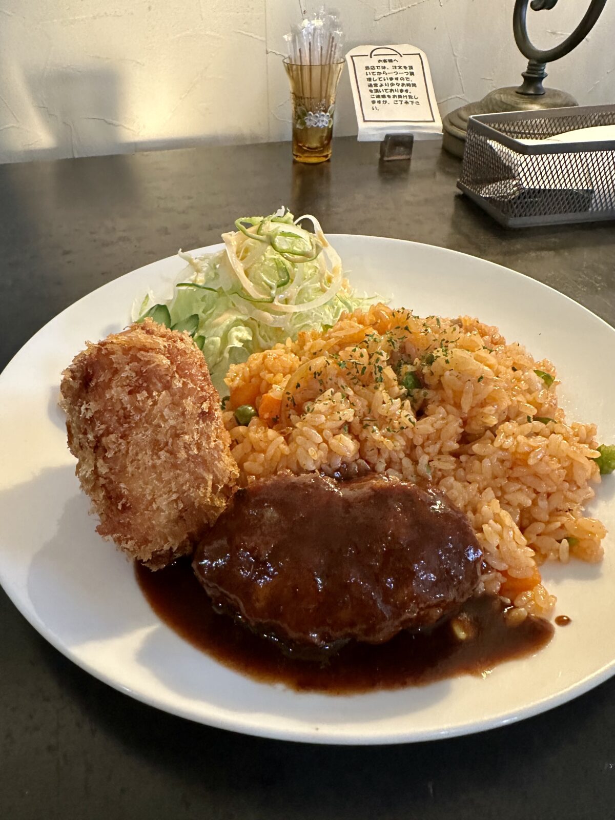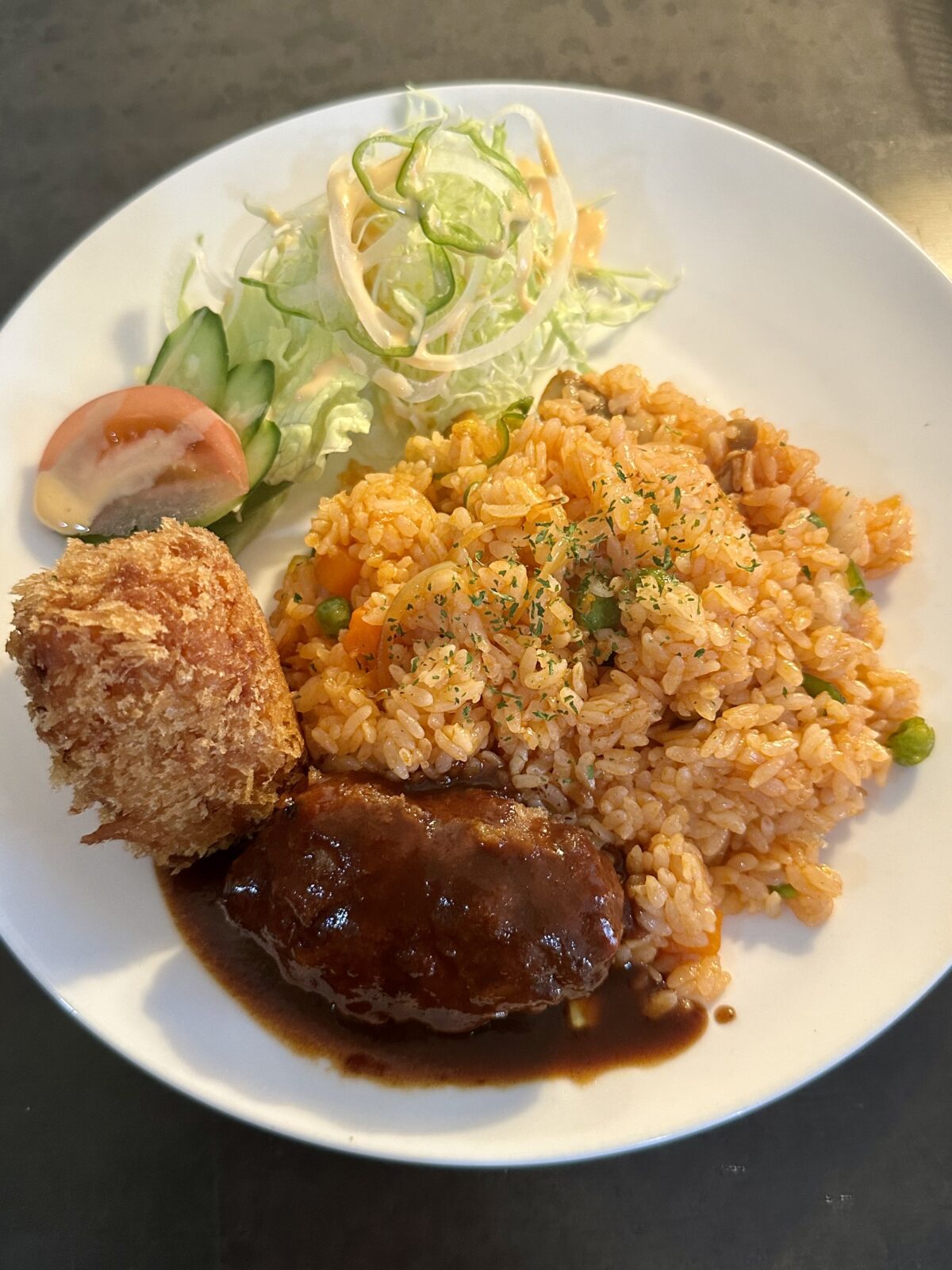 ハンバーグはちょうどいい大きさでデミグラスソースの味がコクがあって好みの味です