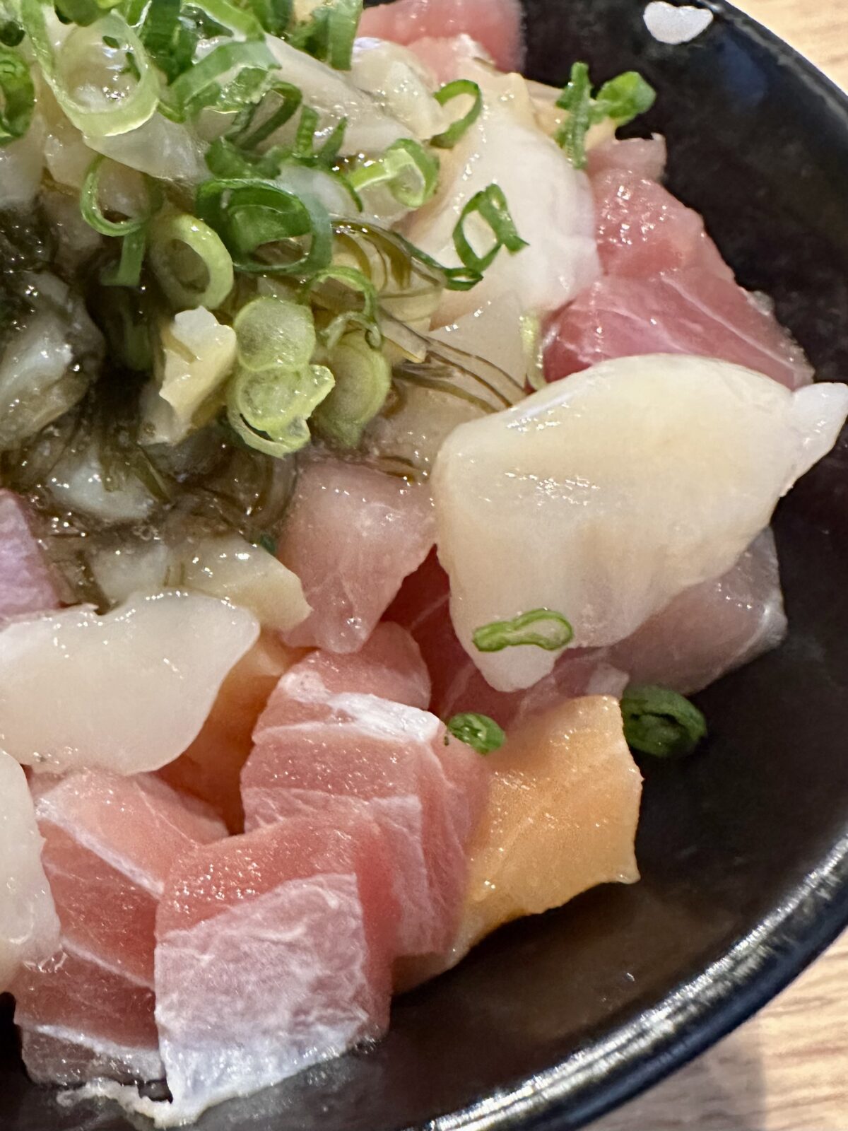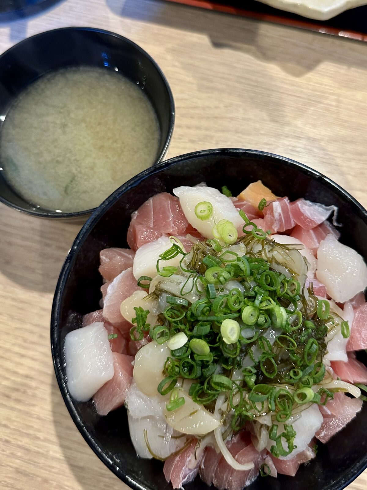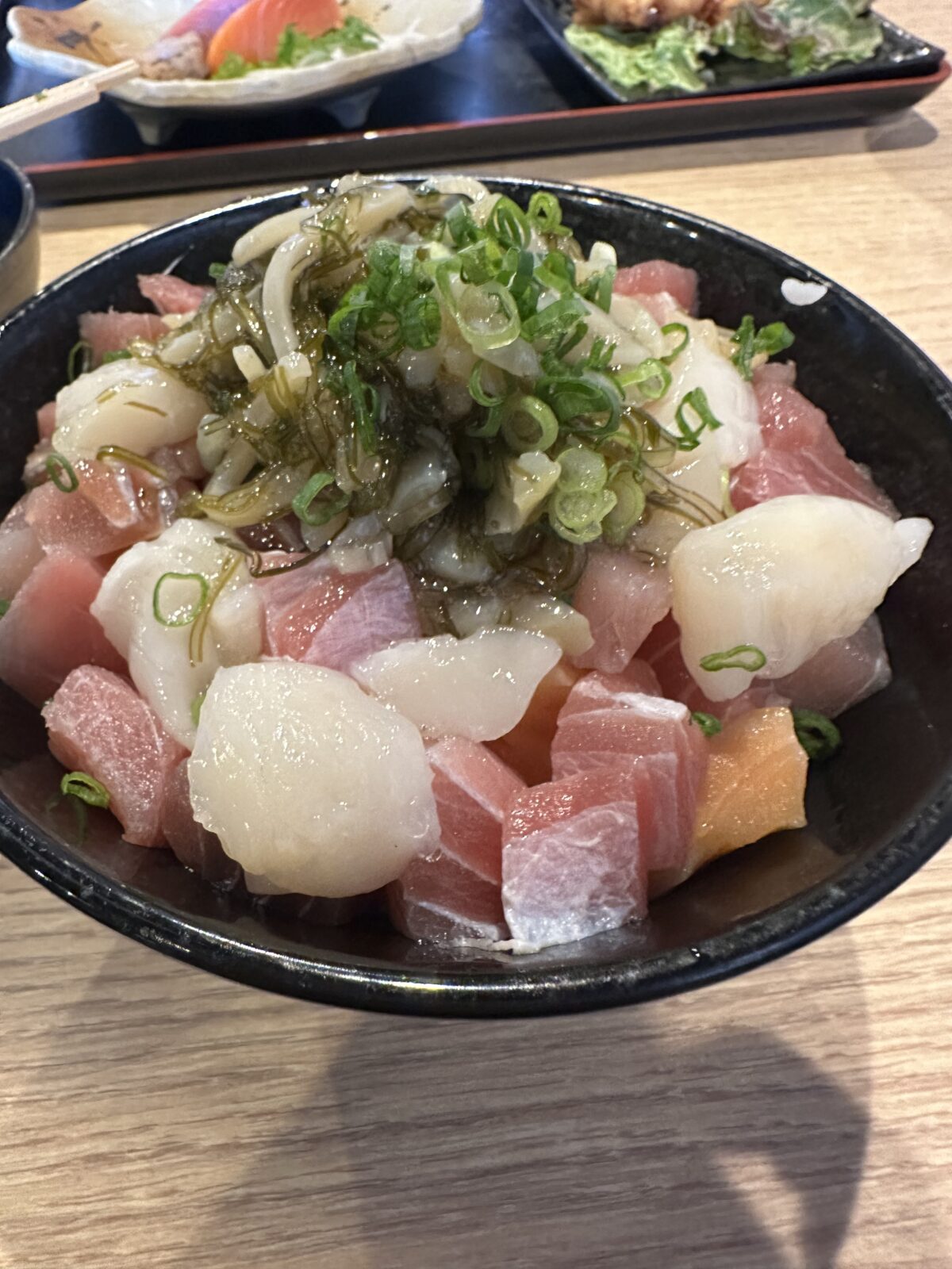 ぶつ切りのマグロがたっぷりとのって、さらにホタテと真ん中に松前漬けがたっぷり
