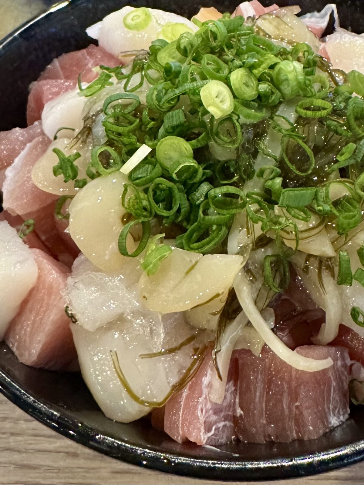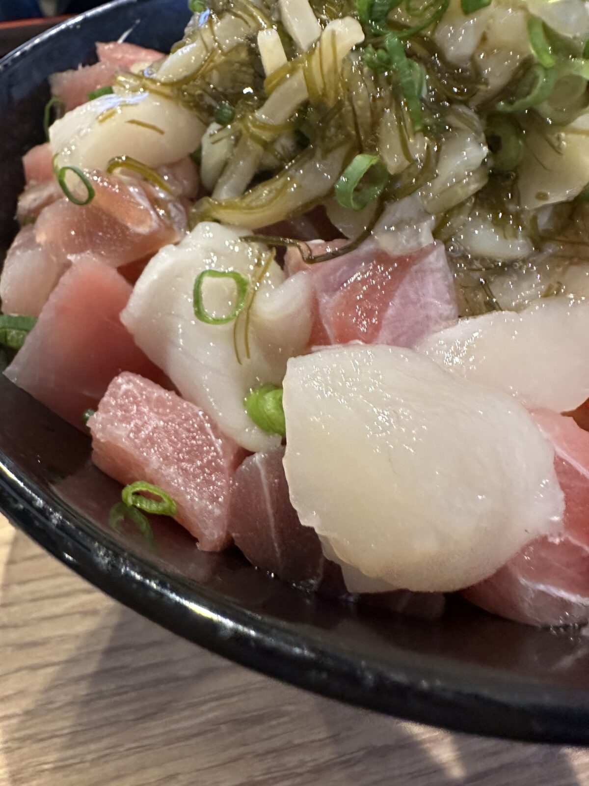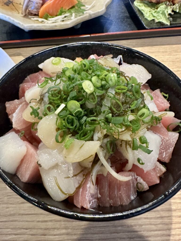 ぶつ切りのマグロがたっぷりとのって、さらにホタテと真ん中に松前漬けがたっぷり