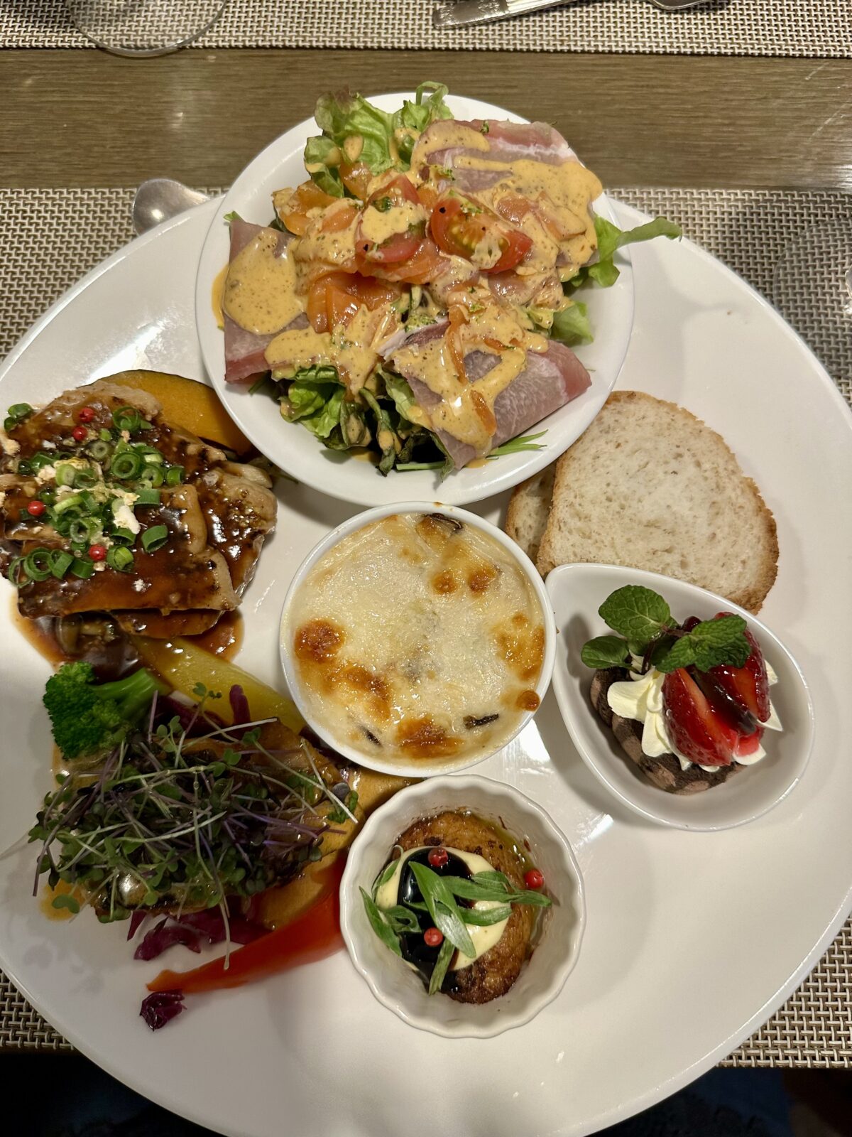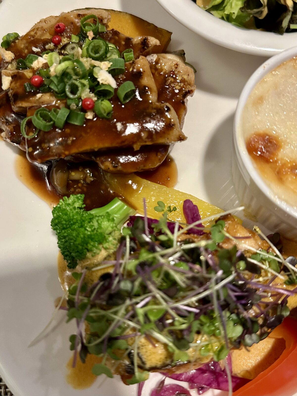 お肉は少し甘めのソース、サーモンはスパイシーなソースで味に変化がありお肉もお魚も両方付くのは凄い!と思いました