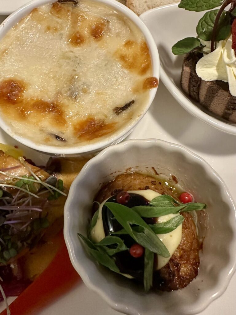 豚肉のソテー、その隣はサーモンのソテーでどちらもソースに特徴がありとっても美味しい!