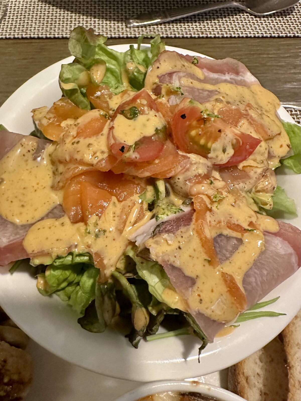 サラダは生ハムがたっぷりと乗って、スパイシーなドレッシングが食欲を増します