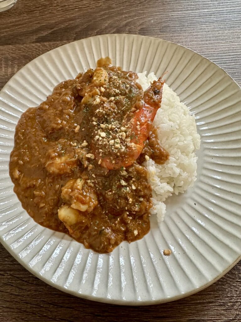 真ん中に大きめな有頭エビ、カレールーの中にもエビ、イカ、ホタテが入ってシーフードの旨味たっぷりのカレーです